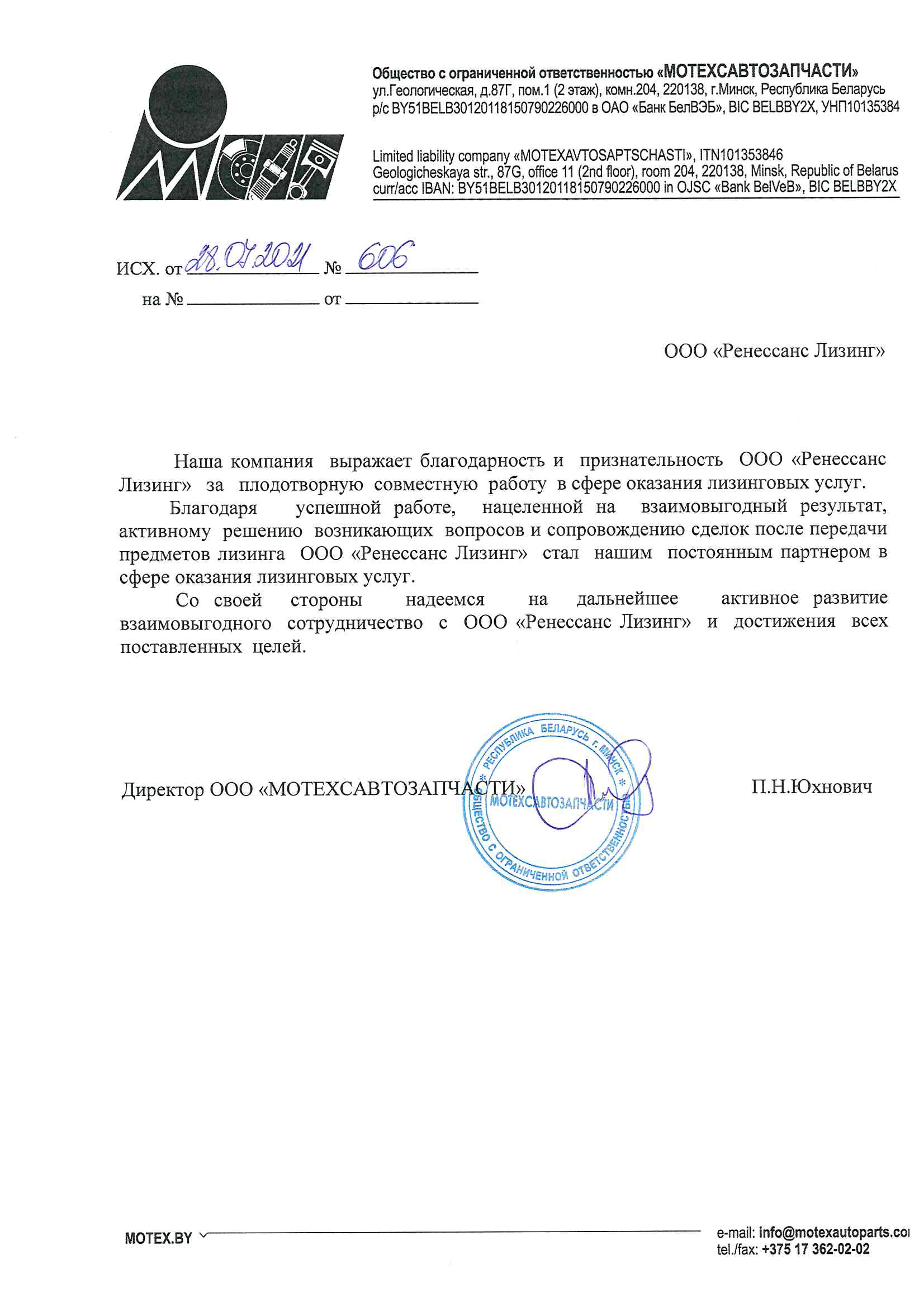 Наша компания выражает благодарность и признательность ООО «Ренессанс Лизинг» за плодотворную совместную работу в сфере оказания лизинговых услуг. Благодаря успешной работе, нацеленной на взаимовыгодняй результат, активному решению возникающих вопросов и сопровождению сделок после передачи предметов лизинга ООО «Ренессанс Лизинг» стал нашим постоянным партнером в сфере оказания лизинговых услуг. Со своей стороны надеемся на дальнейшее активное развитие взаимовыгодного сотрудничества с ООО «Ренессанс Лизинг» и достижения всех поставленных целей.