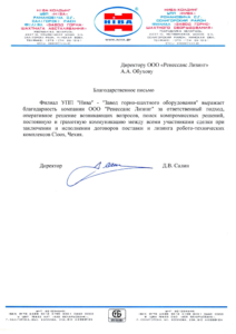 Филиал УПП "Нива" - "Завод горно-шахтного оборудования" выражает благодарность компании ООО "Ренессанс Лизинг" за ответственный подход, оперативное решение возникающих вопросов, поиск компромиссных решений, постоянную и грамотную коммуникацию между всеми участниками сделки при заключении и исполнении договоров поставки и лизинга робото-технических комплексов Cloos, Чехия