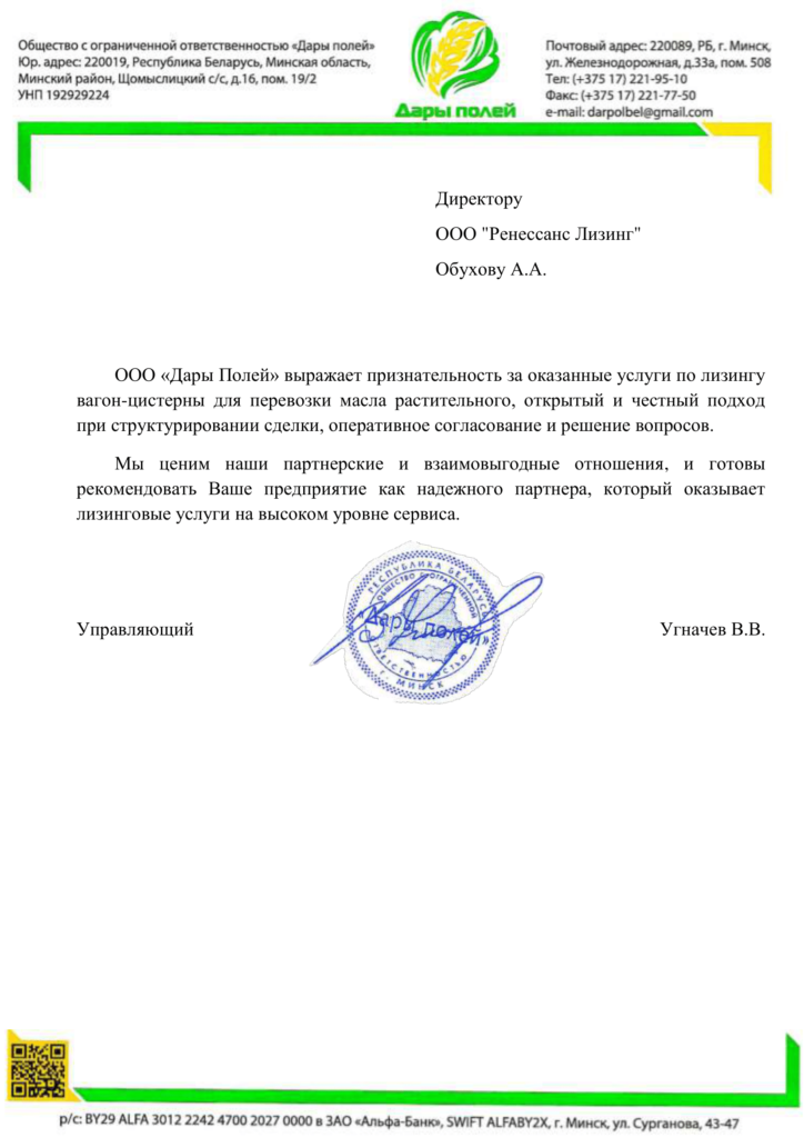 ООО «Дары Полей» выражает признательность за оказанные услуги по лизингу вагон-цистерны для перевозки масла растительного, открытый и честный подход при структурировании сделки, оперативное согласование и решение вопросов. Мы ценим наши партнерские и взаимовыгодные отношения, и готовы рекомендовать Ваше предприятие как надежного партнера, который оказывает лизинговые услуги на высоком уровне сервиса.